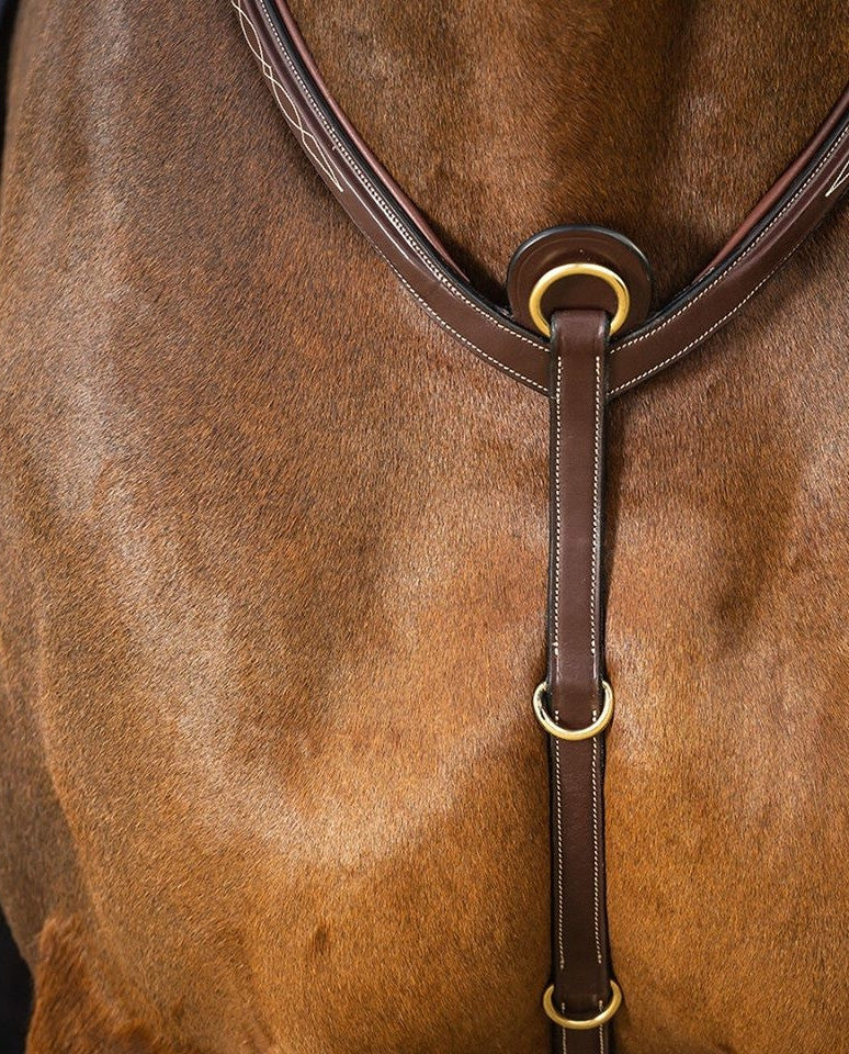 Ce harnais est compatible avec les brides de la collection Dy’on. Il est orné de coutures crème et équipé de boucles couleur cuivre. Le harnais repose librement sur le cou. Pour un confort supplémentaire, un élastique est placé près du point de fixation à la selle. De plus, plusieurs anneaux sont ajoutés pour permettre l’attache facile de rênes auxiliaires à différentes hauteurs. Ce harnais dispose d’un pont réglable des deux côtés. En résumé, c’est le harnais idéal pour le cavalier exigeant.