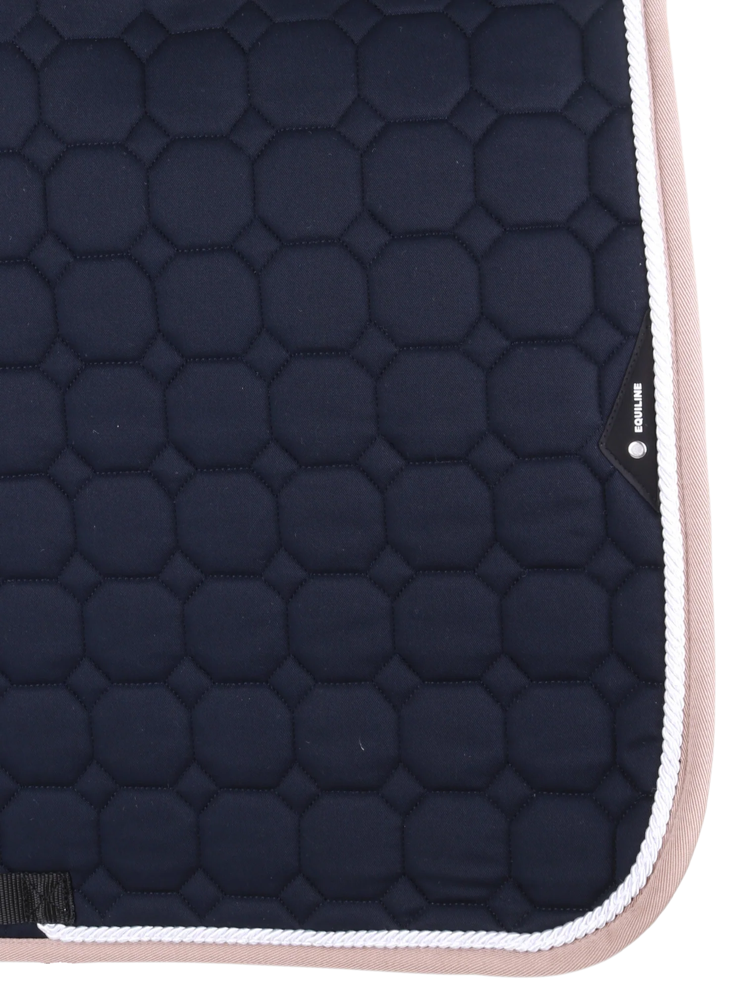 Couverture de selle Octagon en bleu foncé avec une bordure beige et un cordon blanc à l’intérieur.